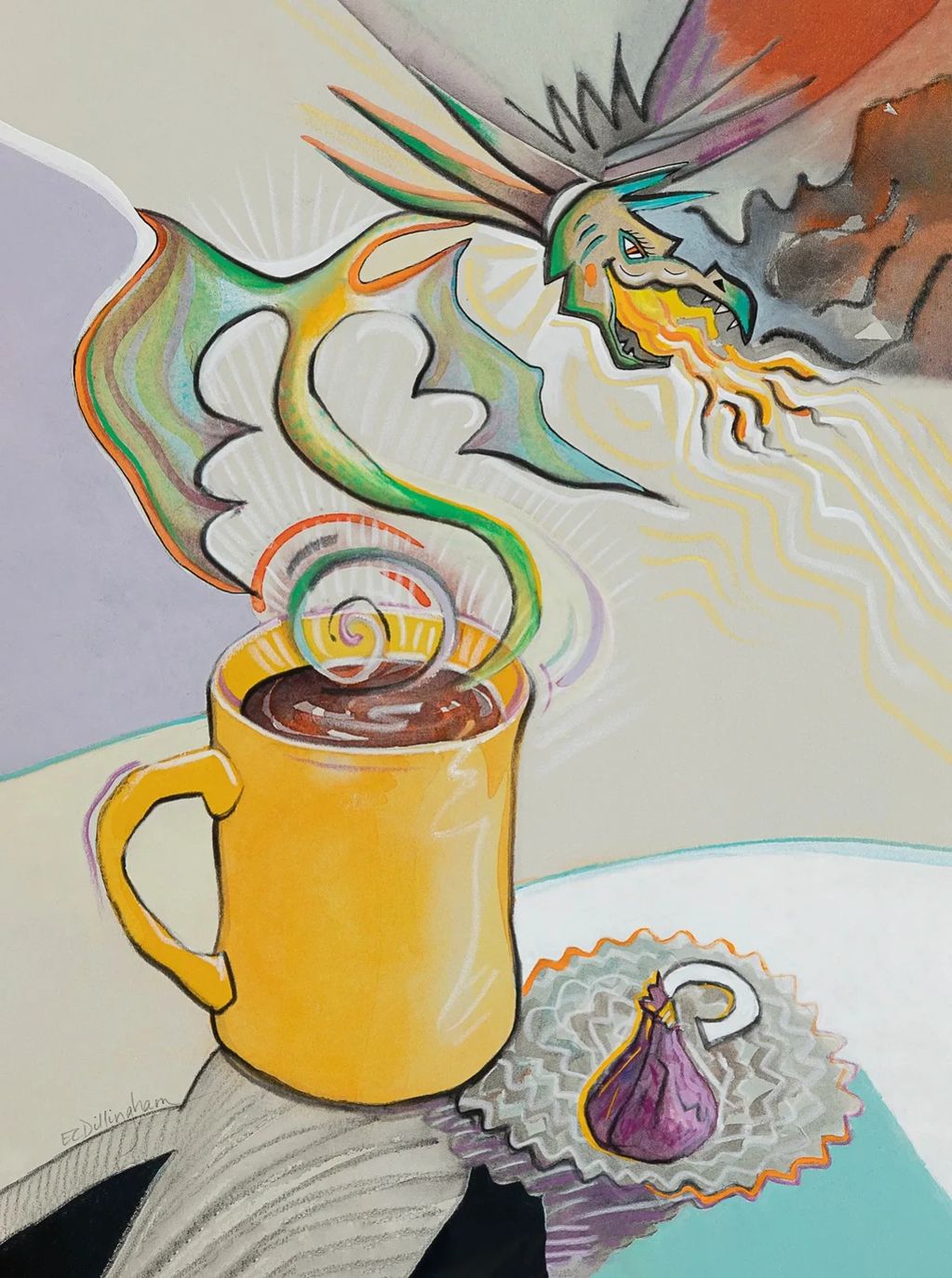 MORNING COFFEE WITH DRAGON AND CHOCOLATE gouache, watersoluble graphite.